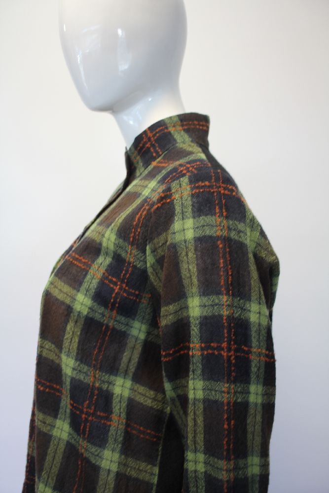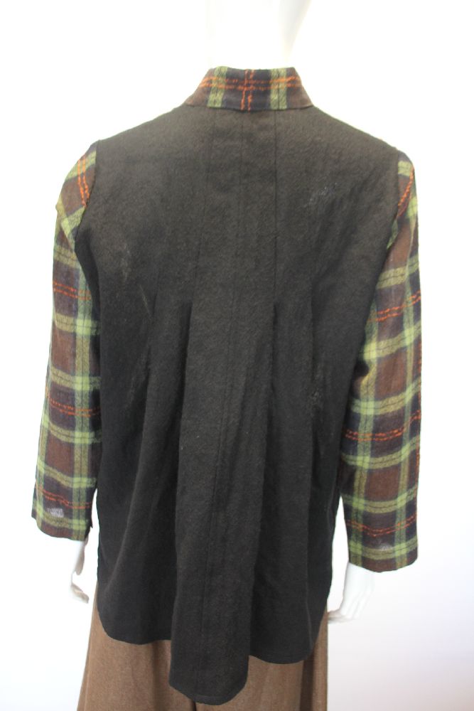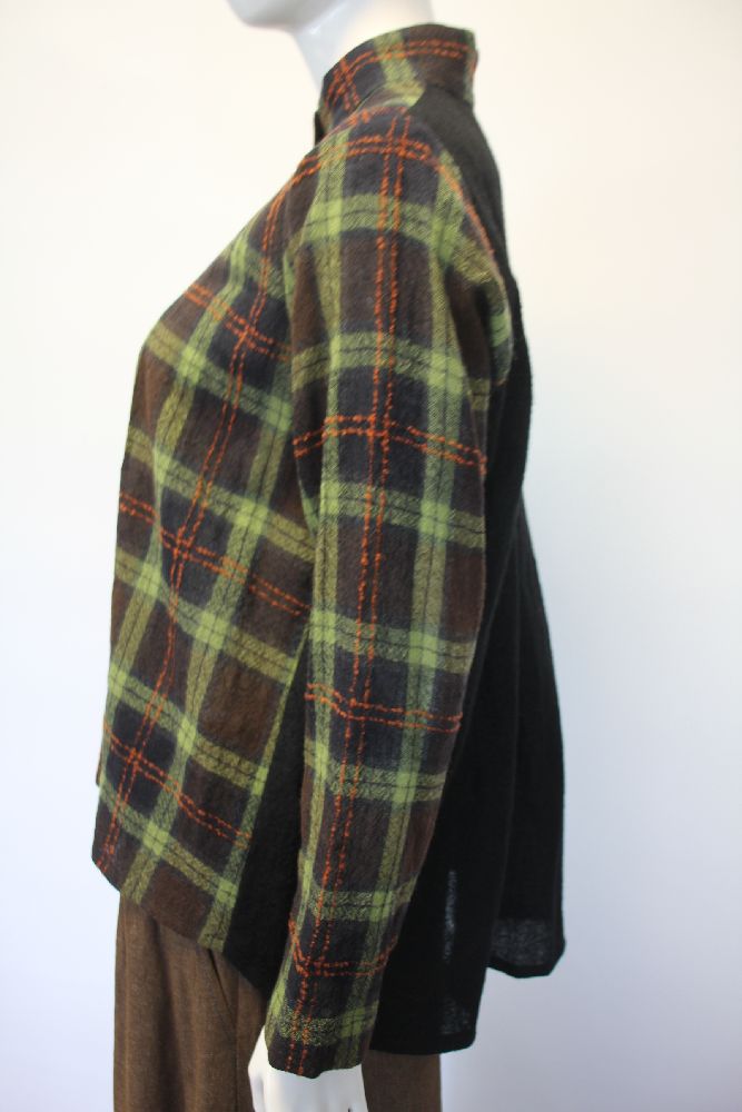 薄手のウールブラウス、チェックと無地のドッキング。 一枚での羽織としても使えるブラウス。 |