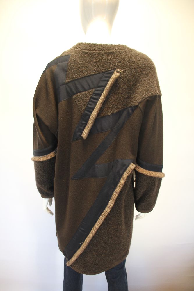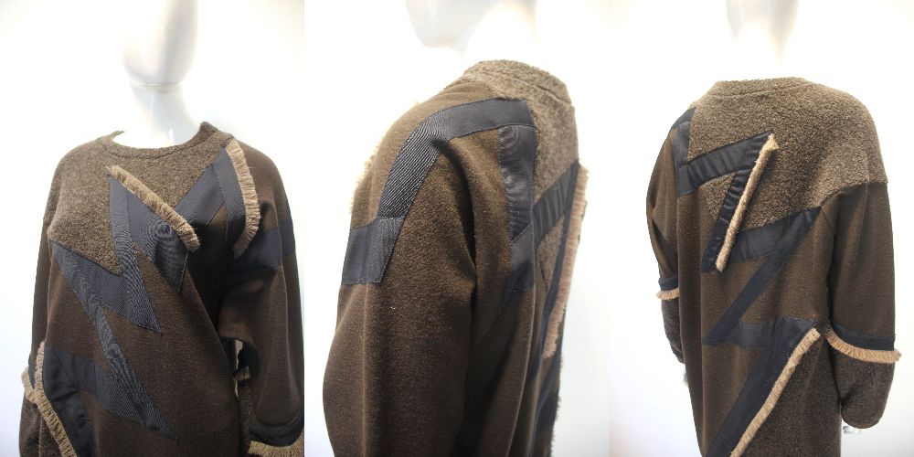 ザギザの切替を大胆に配置した切替かぶりワンピース。 程良いラウンドネック、膝位の着丈、ゆとりのある身巾です。ドロップショルダーには袖口にくり抜き穴の付いた長袖が付いています。 広巾と細巾のレーヨングログランリボンとウール混フリンジで躍動感を表現しています。