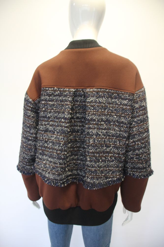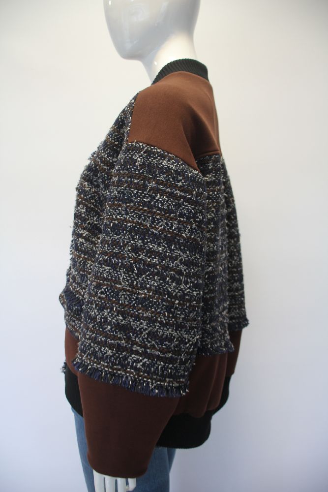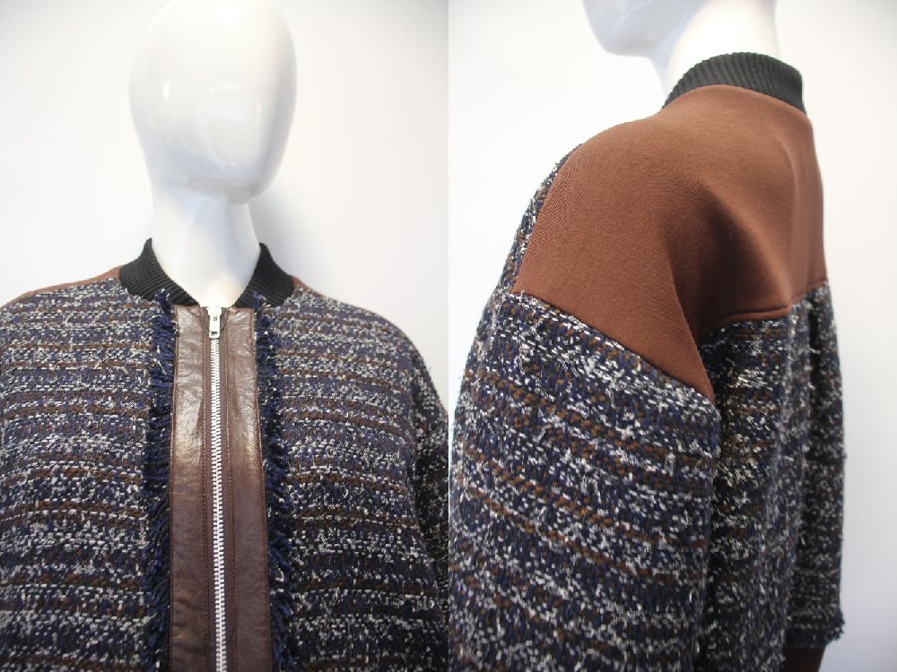 ジャケット ファンシーツイードとダンボールニットのコンビブルゾン。 フロントに合皮を使用。 切り替え部分と袖・裾はダンボールニット。インナーに厚手のニットも着れる、後ろ下がりのオーバーなサイズ感・ |