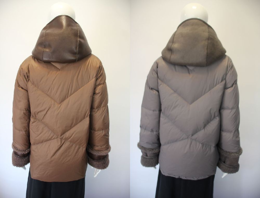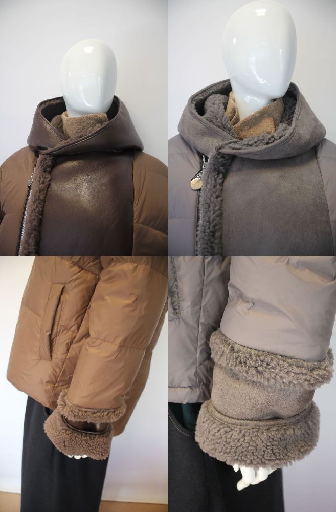 スエード素材とボアをボンディング加工しでいます。 ボアは毛足が長めでボリューム感があります。 袖と後ろはダウンです。 袖どちは折り返すと長さを変えられます、ボアを使用していてとても暖か。 カラー在庫:ブラウンのみです 後ろ裾にはドロストコードで丸みのあるシルエットが楽しめます。 ブラウンはボア裏フェイクレザー グレーはスエード |