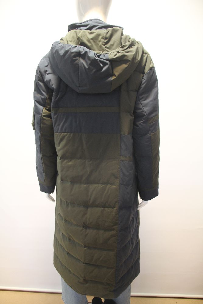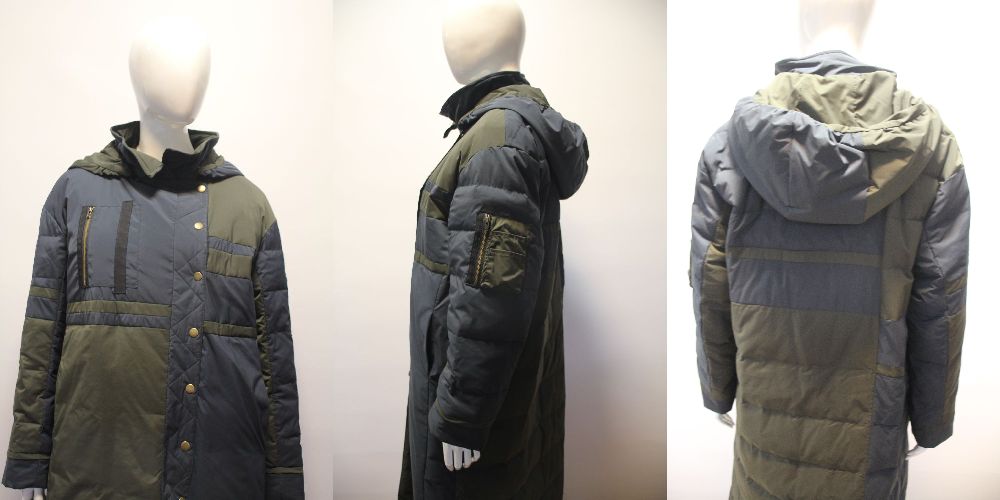色での切り替えがポイントのダウンコート。 ダーク系カラーでのバランスが絶妙でお洒落に仕上がってます。 フードは取り外し可能、襟にはワイヤーを使用しているので、立てる事もできます。 |
