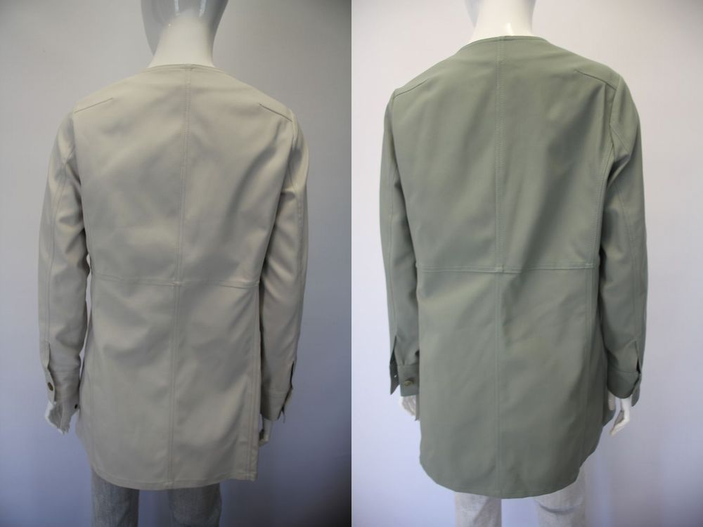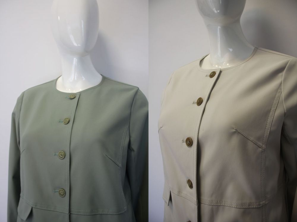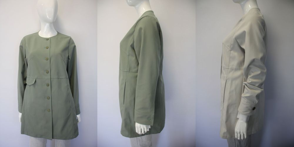 ノーカラーのシンプルなデザインのケアフリーコート、サイドポケット付き、ウエスト切り替えですっきりしたシルエット。 |