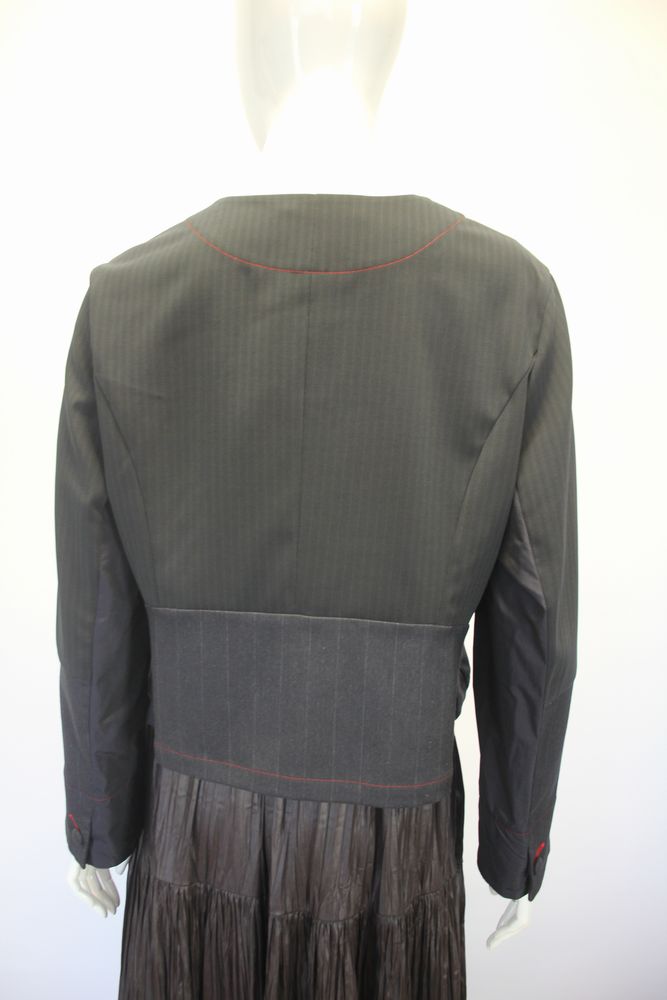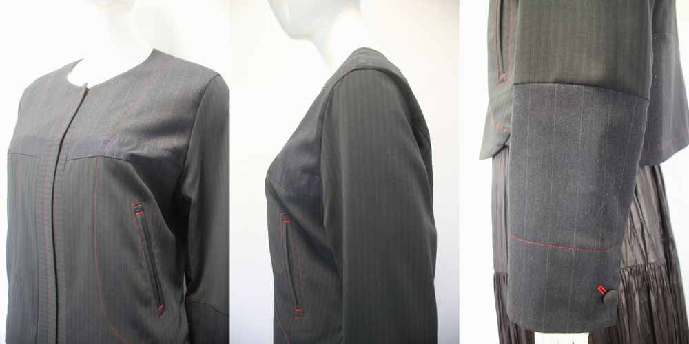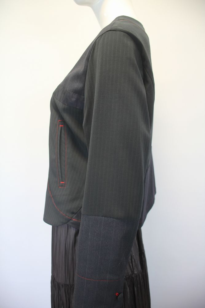 3素材を複雑に切り替えたジャケット。 @ポリエステルにウレタンを混紡したストライプ Aポリエステルにレーヨンのしっかりした素材 Bストレッチ・光沢を抑えたシャンブレーのかかったポリエステルタフタ素材 ベースカラーネイビーに赤のステッチがポイントのジャケットです。 裏地なし |