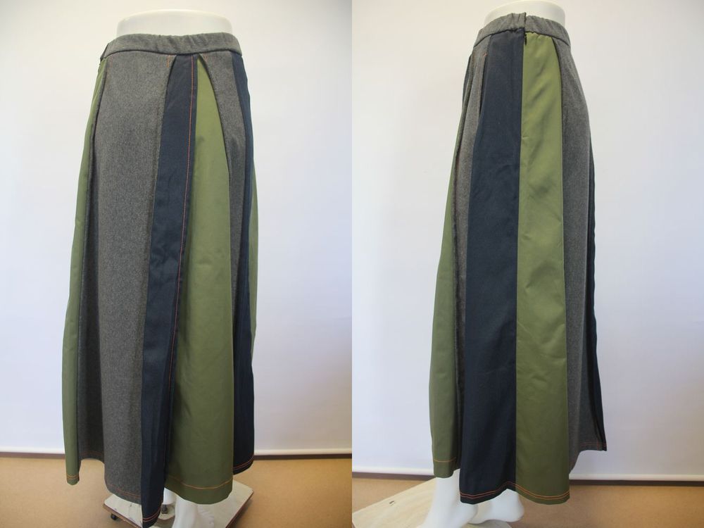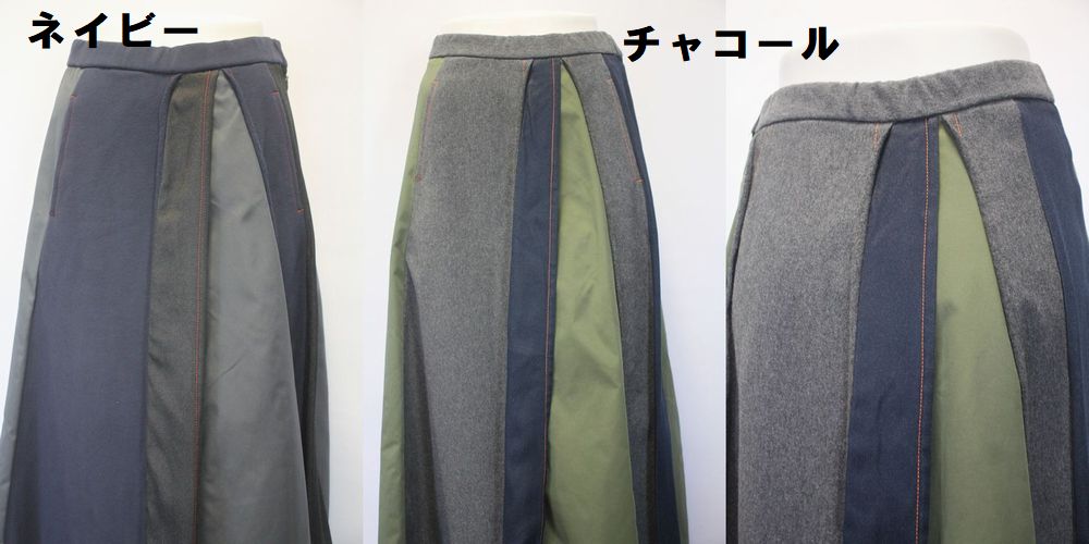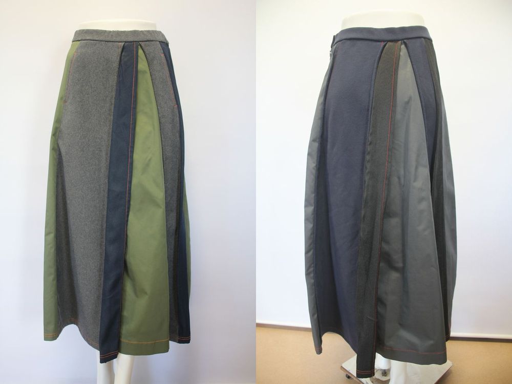 3つの素材をランダムに複雑に切り替えたフレアーラインのスカート。 裏毛素材・ポリエステルベースのデニム・ポリエステルタフタ。 |