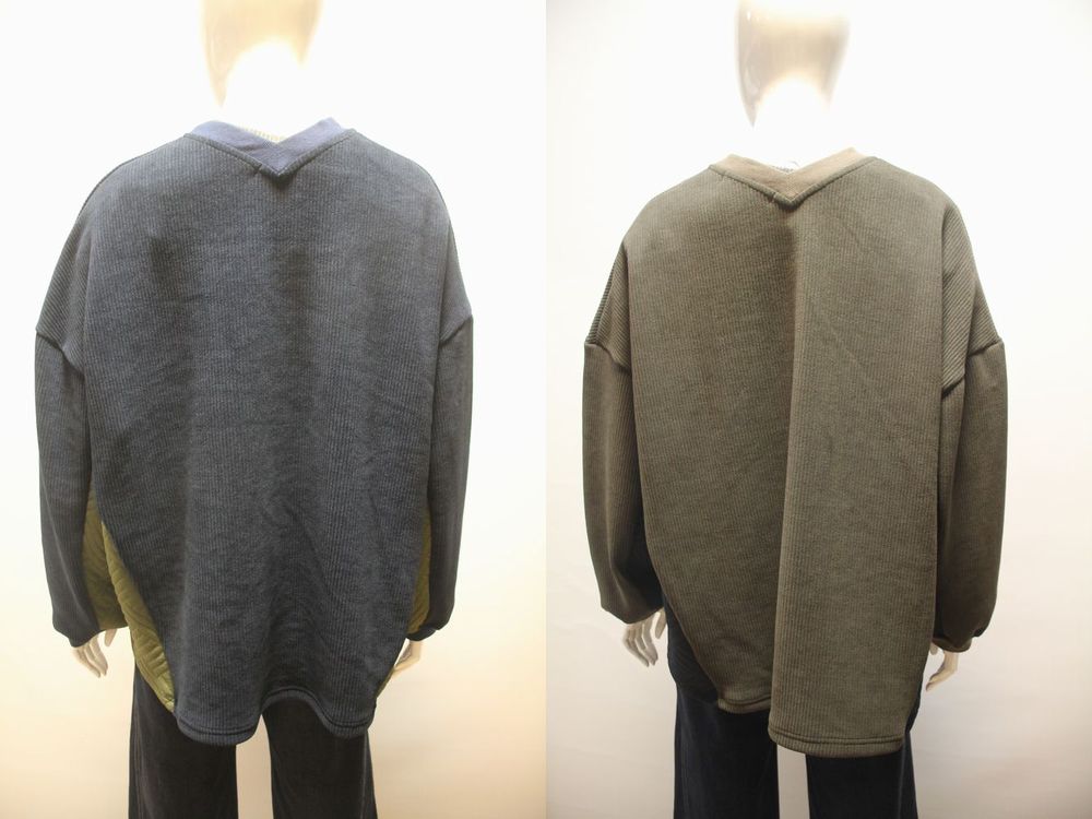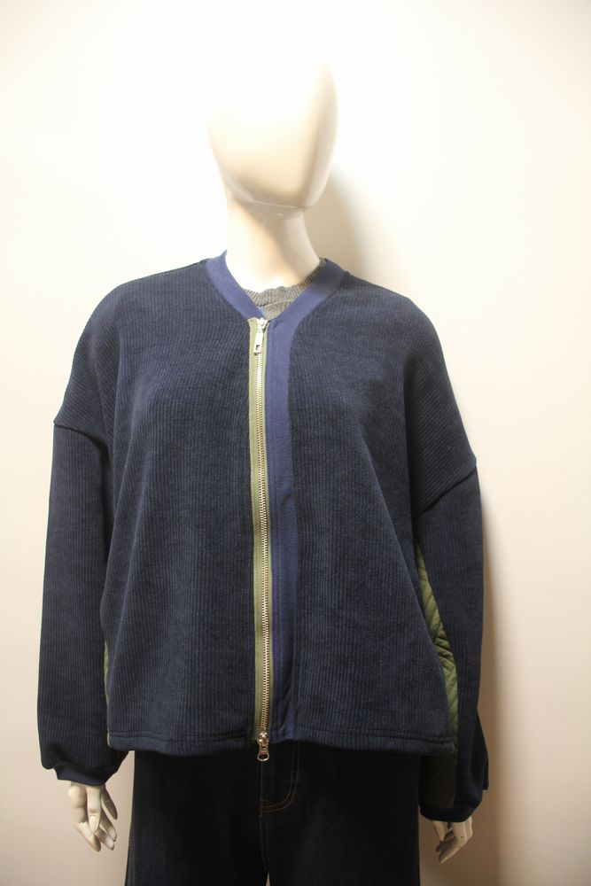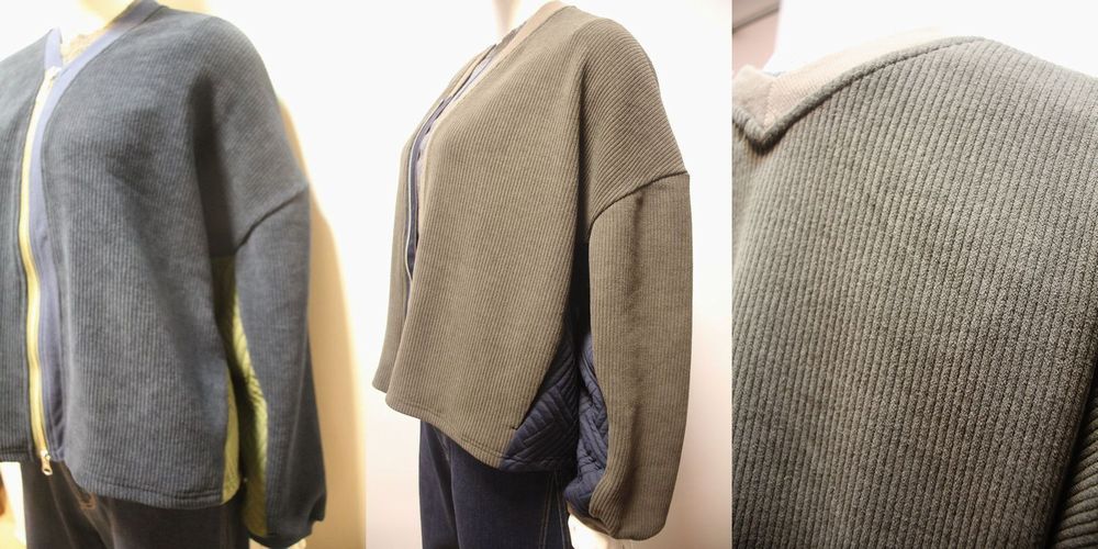 モール糸を使用することで、ベロアのような上品な光沢感を持たせたニット コーディロイとストレッチ性に優れたパウダータッチのキルティングを組み 合わせたZIP UPカーディガン。 |