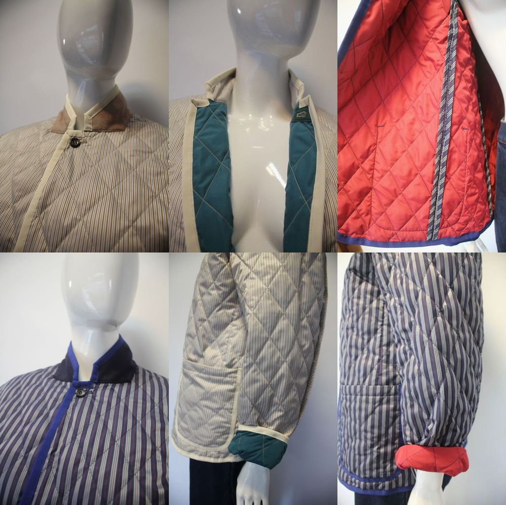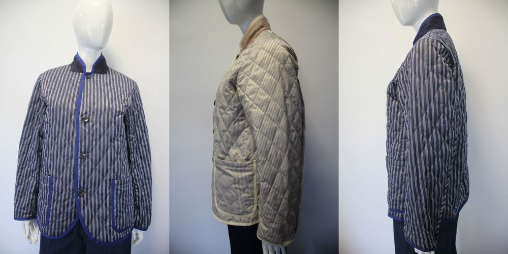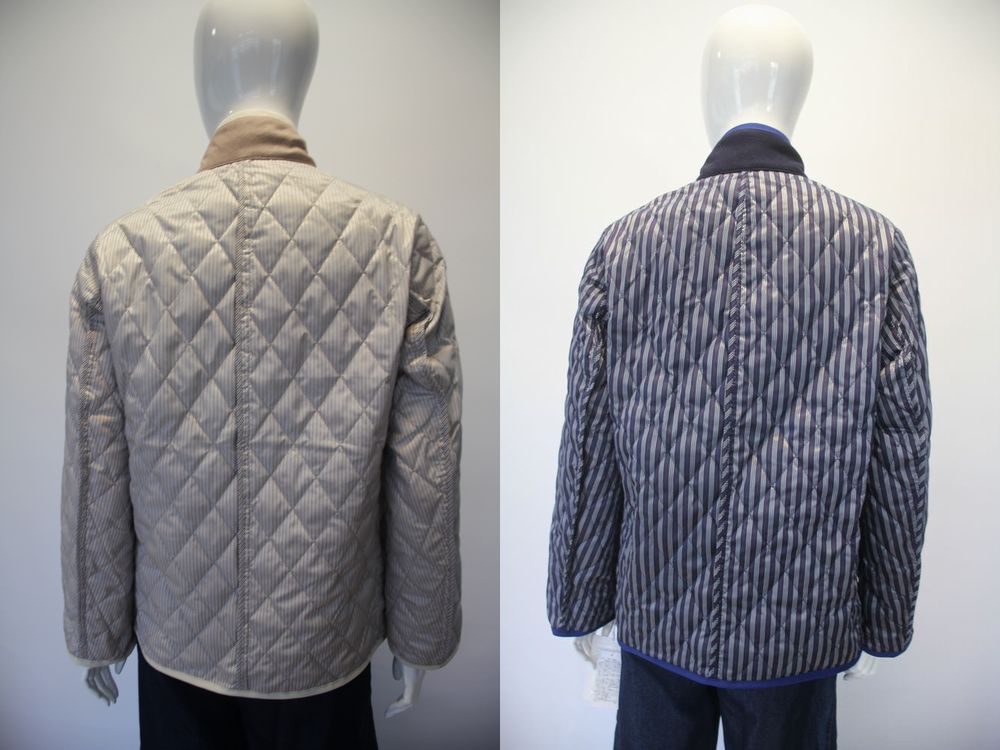 マルチストライプの軽量ナイロン素材にダウンパックを挟み、サンドイッチ 状にキルト加工を施しています。ゴワゴワせず柔らかい肌触り、ダウン仕様 による保温性で暖かい素材感。 |