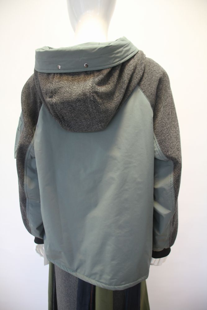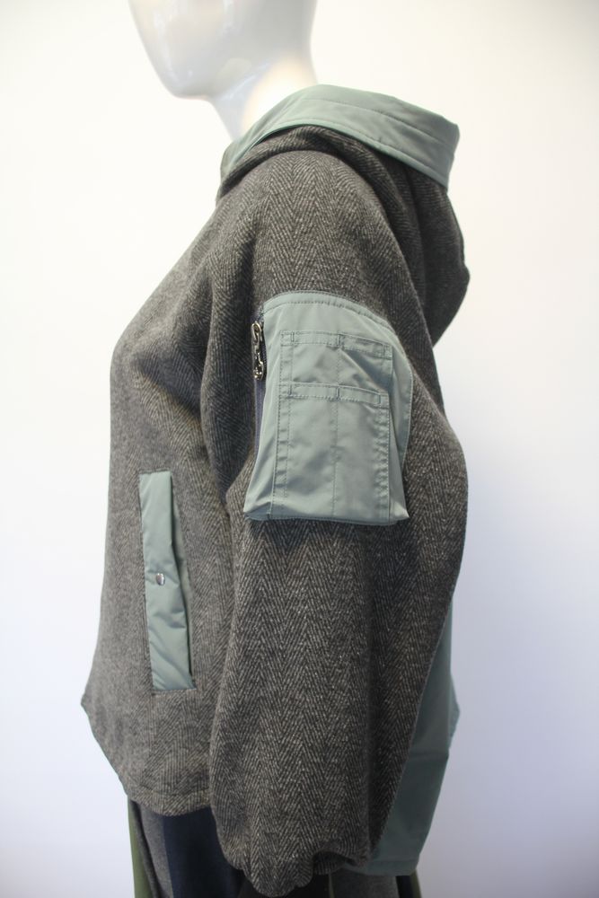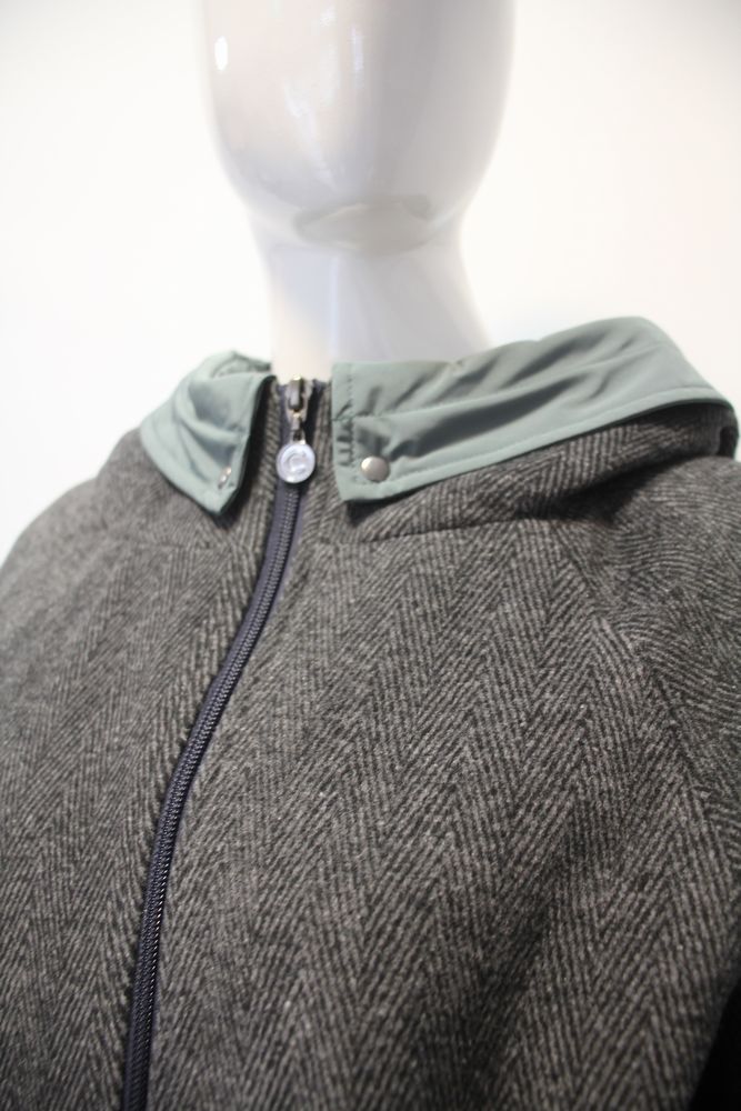 ヘリンボーンとタフタのブルゾン。 フード、サイドポケット付き。 裏地あり。 |