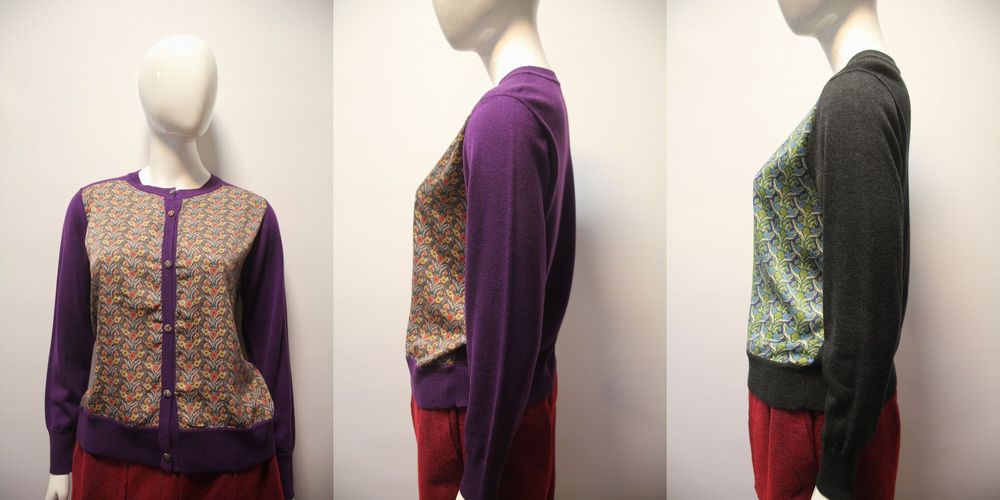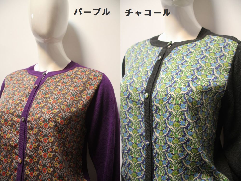 布帛とニットのドッキングカーデ プリント生地のクルミボタンがポイント。 |