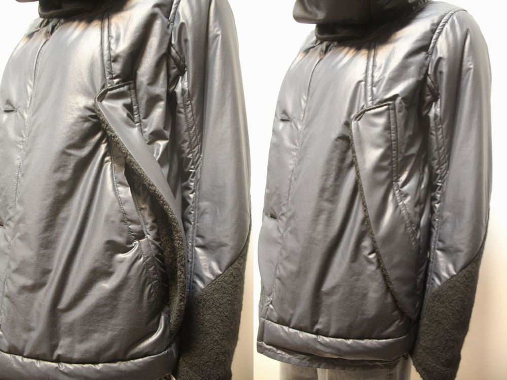 素材には、ソフトで滑らかなタイプライター素材を使用しています。 特殊加工によるシルキーな光沢、洗い晒しのような適度なシワ感が互いの良さを残しつつ両立しており、また撥水加工も施しています。 別布にモコモコとしたウールパイルを配色使用し、アクセントにしています。 |