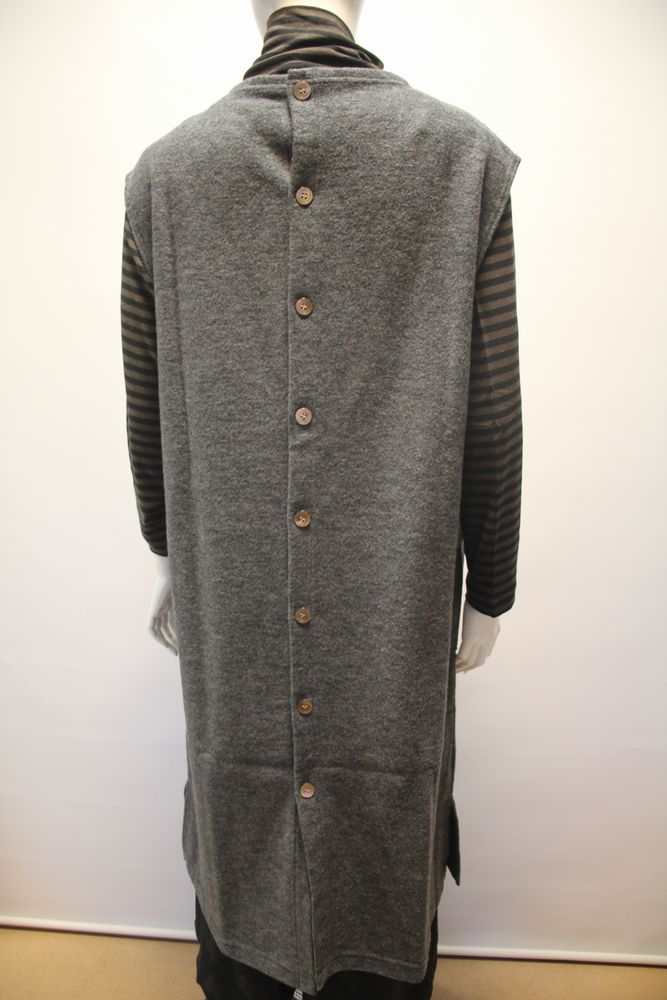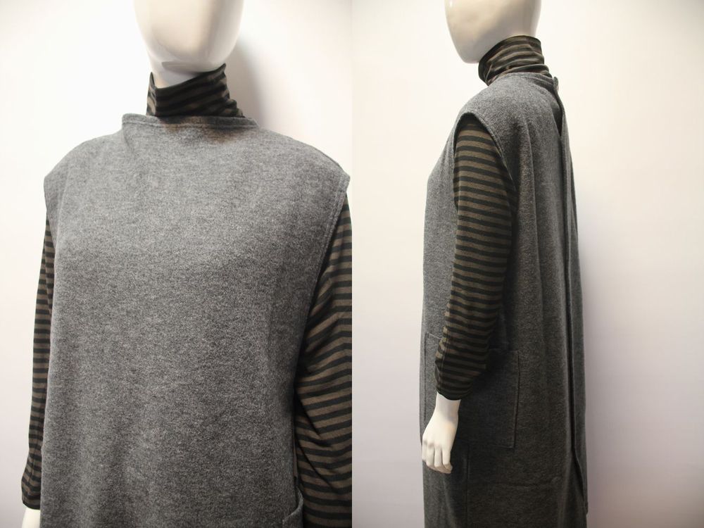 柔らかく保温性のあるボーダー柄のワンピースとロングジレのセットアイテム。ジレは前後逆にしても着用でき、スタイリングに合わせてアレンジが可能です。大き目のポケットや釦のアクセントが着こなしのポイントになってくれます。 |