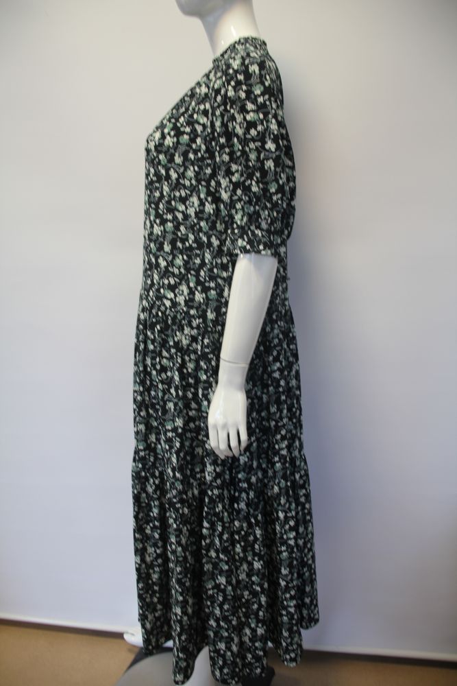 小花プリントワンピース。五分袖。 スカート部分はティアード、襟元にゴムシャーリングを施したデザイン。 ベースはブラック |