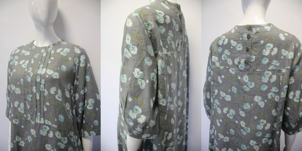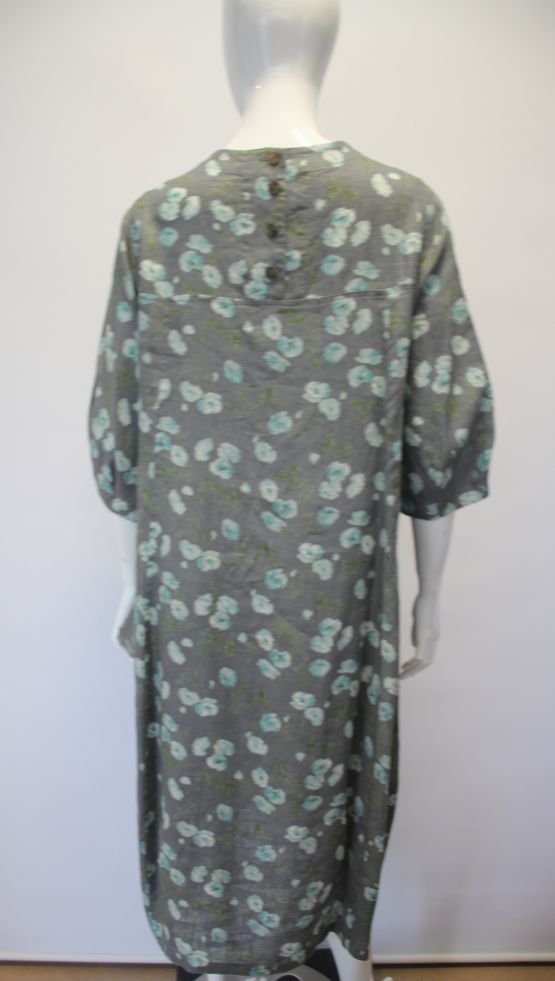 七分袖麻素材のプリントワンピース。 裾はタックでバルーンっぽいデザイン。後ろボタンサイドポケット付き。 裏地なし |