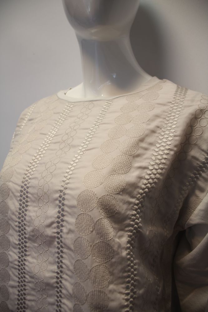 様々なドットをストライプ状に配置した、繊細でデザイン性の高い刺繍生地を使用。洗練されたモードな雰囲気と、着心地の良さを両立したプルオーバー。 カラー在庫:ライトグレー |