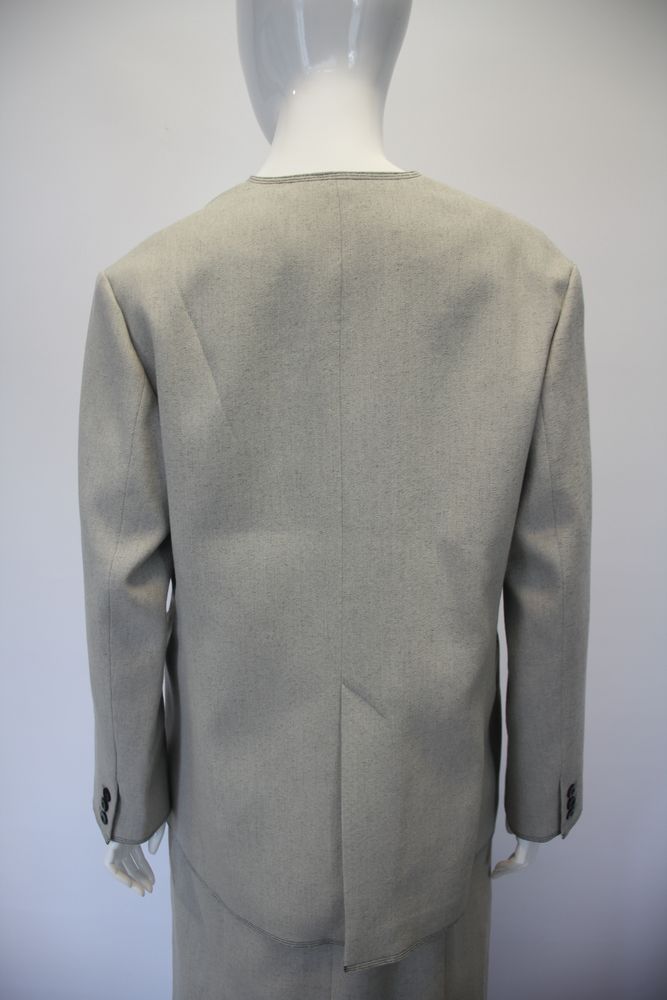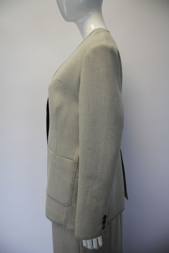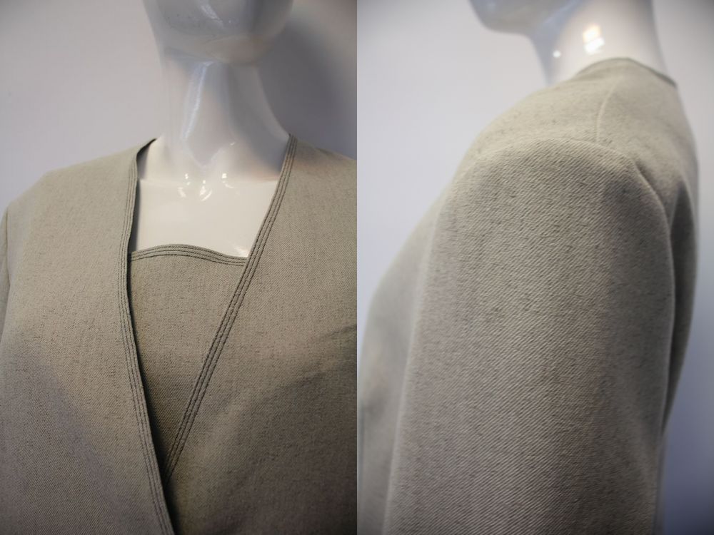 レーヨン混ツイルストレッチ トルコで紡績した麻調の混紡糸を使用。 麻のトップ糸使いの様な高級感のある表情とドライなタッ チが特徴。 適度なストレッチ性があり、軽さと動きやすさを両立。 ドライな肌触りで、汗ばむ季節もさらりと軽やかに羽織れ る一着です。 ウエストはやや内側に入れ、すっきりした見え方に。ゆとりは保ち着心地は良く、腰位置が自然に決まるパターン設計。 見返しにあしらった黒の配色が、ノーカラーの襟ぐりを一層シャープに引き立てます。 同素材ワンピース【5102】とのコーディネートで統一感のあるクリーンなスタイリングが完成。 |